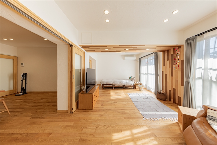 ダイニングキッチンへ開放的に繋がる広い寝室は、
